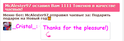 Привет, я Алиса, с Новым годом! Мило улыбнуться 22) ноги - 45, грудь - 101. пися - 121. Крути рулетку! Меню выше! Ник на теле 199 токенов. Запросы без токенов - БАН! Хожу в группы и приваты:)