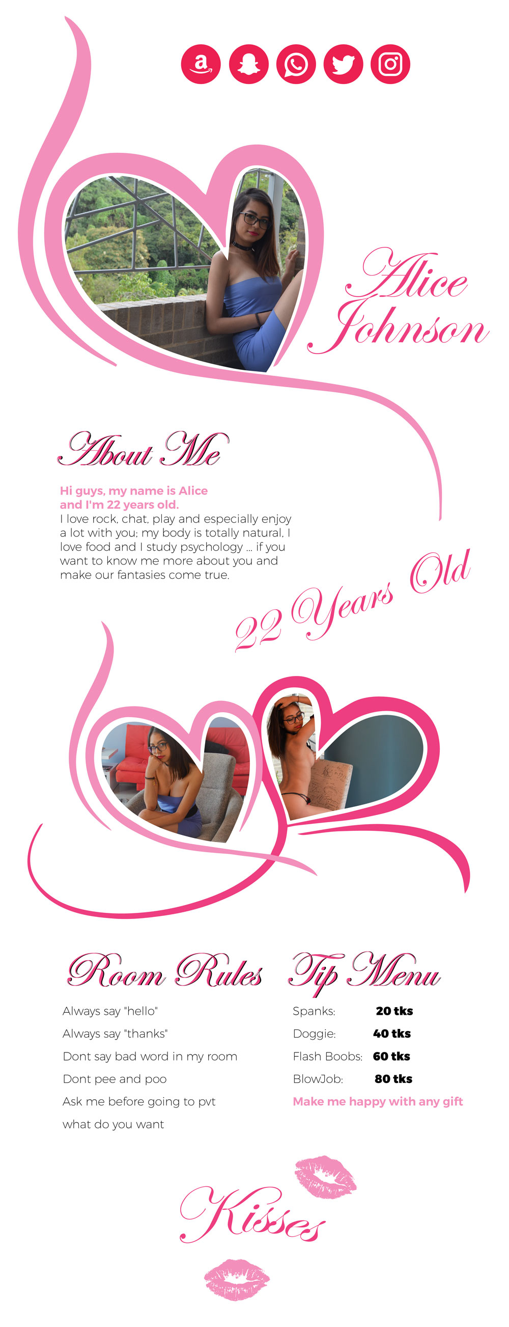 Нажав на кнопку, вы поднимете AliceJohnsonn на 1-е место главной страницы сайта на 60 секунд. В течение этого времени чат-комната модели станет максимально заметной и популярной! В чате появится оповещение о вашем действии, которое увидят модель и все другие пользователи чата. AliceJohnsonn непременно оценит такой знак внимания с вашей стороны и будет вам невероятно признательна!