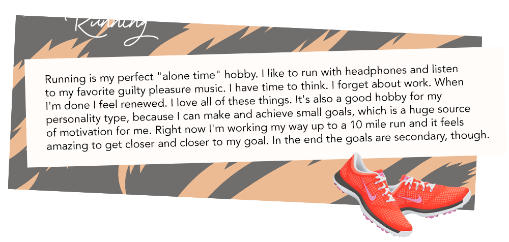 I have a bunch of hobbies, it’s great to have a bunch of stuff to choose from doing at any point. Writing, reading, running, jewelry making, doodling, baking…